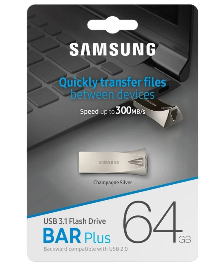 Samsung 64GB USB 3.1 BAR Plus pendrive - Ezüst, 300MB/s olvasási sebesség, vízálló és tartós fémházas kialakítás, gyors és biztonságos adattárolás mindennapi használatra